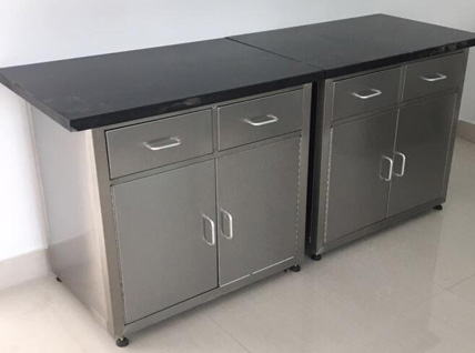 不銹鋼臺面:采用S304不銹鋼四邊折彎內襯18-25MM夾板制作(刨花板、中纖板、實芯理化板、環氧樹脂板、千思板、陶瓷板等臺面,根據客戶需求提供);