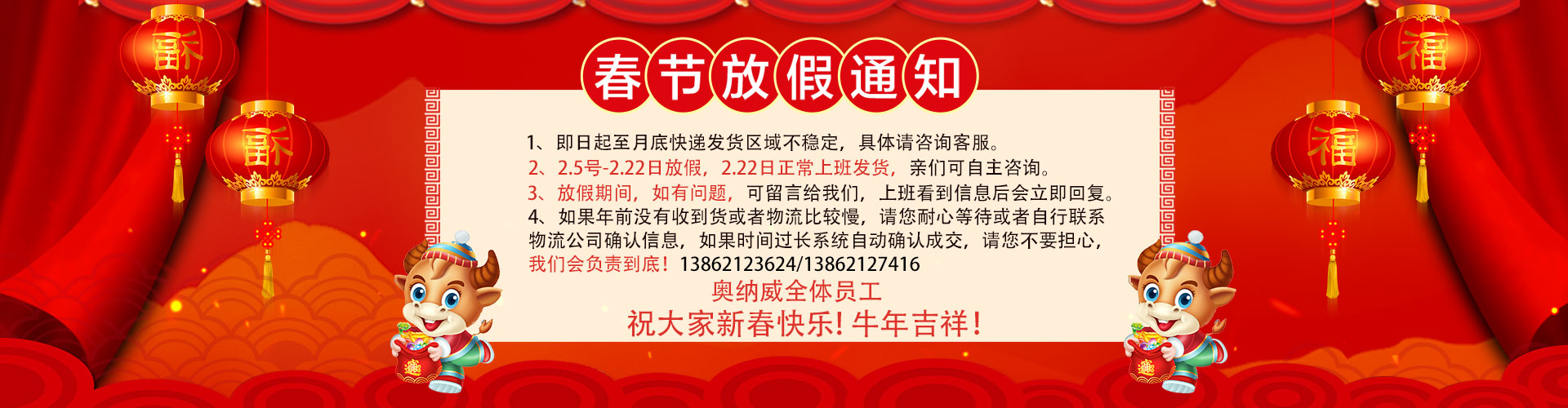 尊敬的客戶,您好,結合疫情進展情況以及本公司的政策,現將本公司2021年年假及春節放假安排:2021年2月5日---2021年2月19日(正月初八),放假期間安裝及售后暫停服務,業務咨詢正常溝通,感謝新老客戶在2020年對本公司的信任和大力支持,2021年將更加努力把最優質的服務給到到客戶,放假期間聯系電話:13862123624,在此奧納威全體員工提前祝各位老板春節快樂,財源廣進!