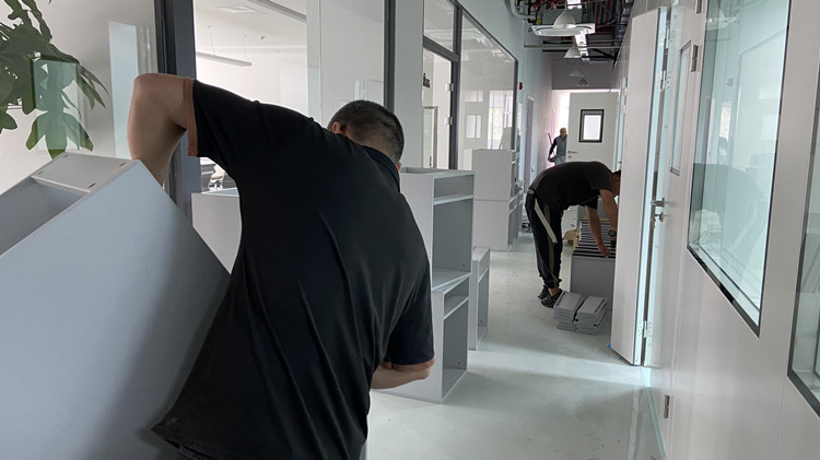 這是另外幾個安裝師傅在走廊中組裝實(shí)驗(yàn)臺下體柜,鋼木柜體材質(zhì),鋼架是40*60*1.5mm的,臺面及是18mm的厚臺面。